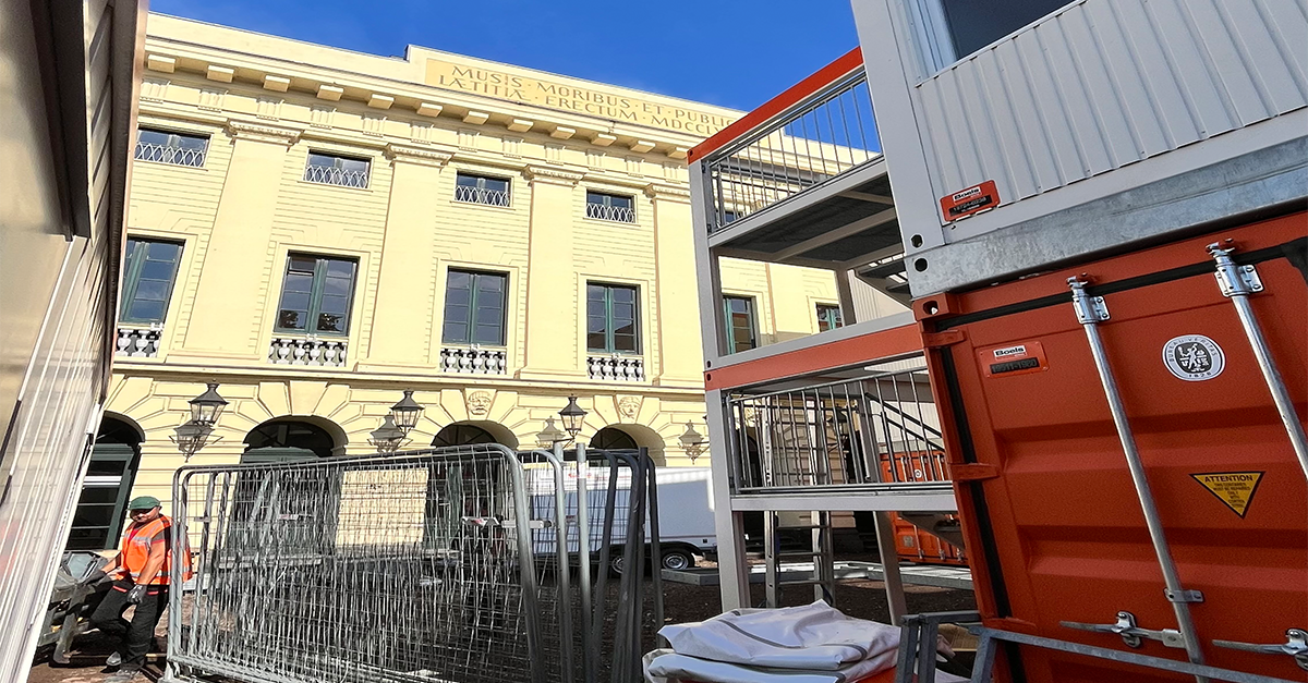 In den letzten Wochen wurde die Baustelle eingerichtet und die ersten Arbeiten konnten beginnen. Die Bühne ist leergeräumt und die Ausstattung wurde bereits in die Interimsspielstätte gebracht.