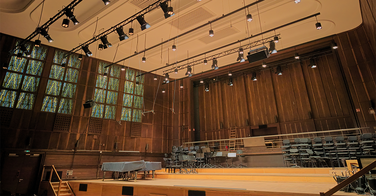 Im großen Saal der Hochschule für Musik und Darstellende Kunst wurde die Beleuchtung umfassend modernisiert. Die bisherige Anlage war in Bezug auf Helligkeit, Gleichmäßigkeit und Farbwiedergabe nicht mehr ausreichend, um den Anforderungen von Veranstaltungen, Proben und Aufzeichnungen in vollem Umfang gerecht zu werden.